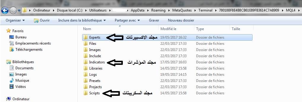 سيفتح لك المجلد الخاص بالمنصة المفتوحة ثم ادخل لمجلد MQL4 ستجد ما يلي كما بالصورة