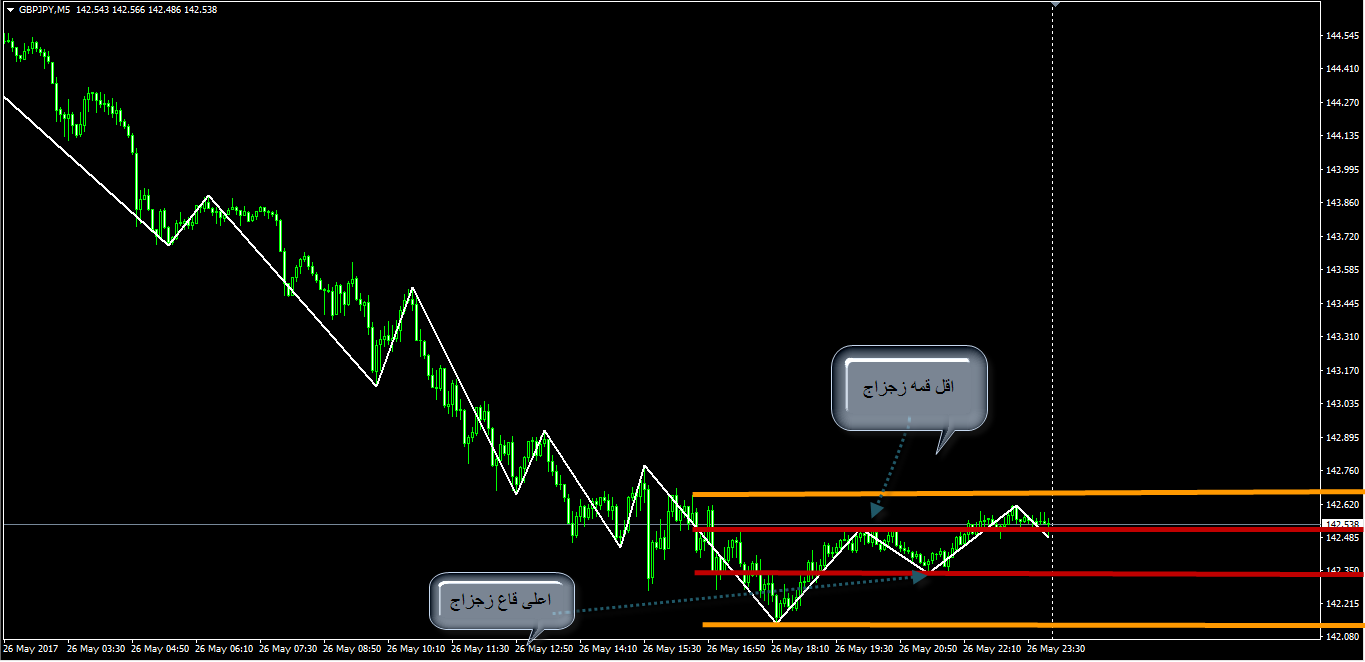 ويتم رسم خط على اقل قمه zigzag وخط على اعلى قاع zigzag خلال هذة الفترة