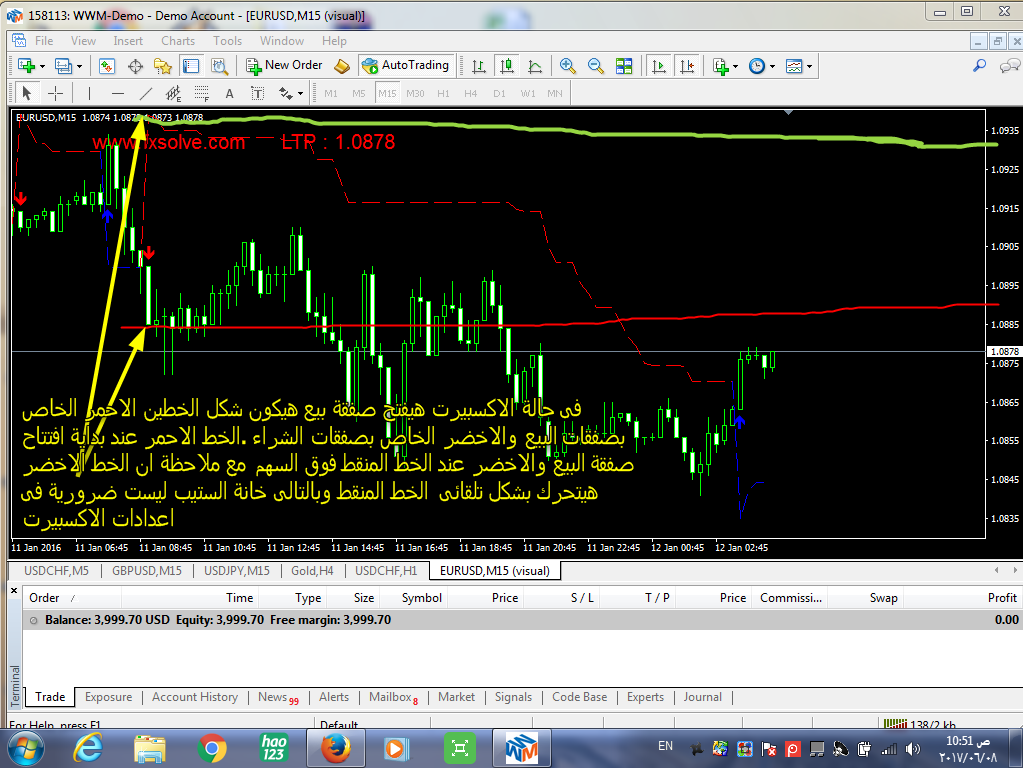 ملحوظة هامة . اذا لمس السعر الخط الاخضر وفتح صفقة الشراء ثم رجع تانى لمس الخط الاخضر لايفتح صفقة اخرى شراء طالما صفقة الشراء المفتوحة لم تغلق على الربح الاجمالى المحدد بالتريلنج ستب او ستوب. وكذلك الامر مع الخط الاحمر الخاص بالبيع.