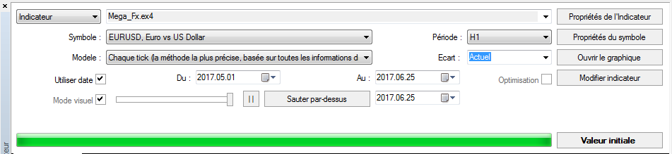 ثم إختر indicateur وهو الخيار الموجود في أقصى اليسار ثم علم على خيار Mode visuel ثم إختر التوقيت واجعله اخر شهر أو اخر شهرين ثم شغل الباكتيست