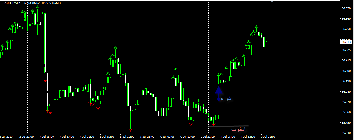 عند ظهور اول سهم اخضر يتم فتح صفقه شراء والاستوب عند اختراق السعر لاخر سهم احمر سابق لصفقه الشراء