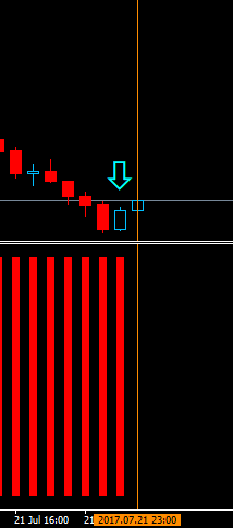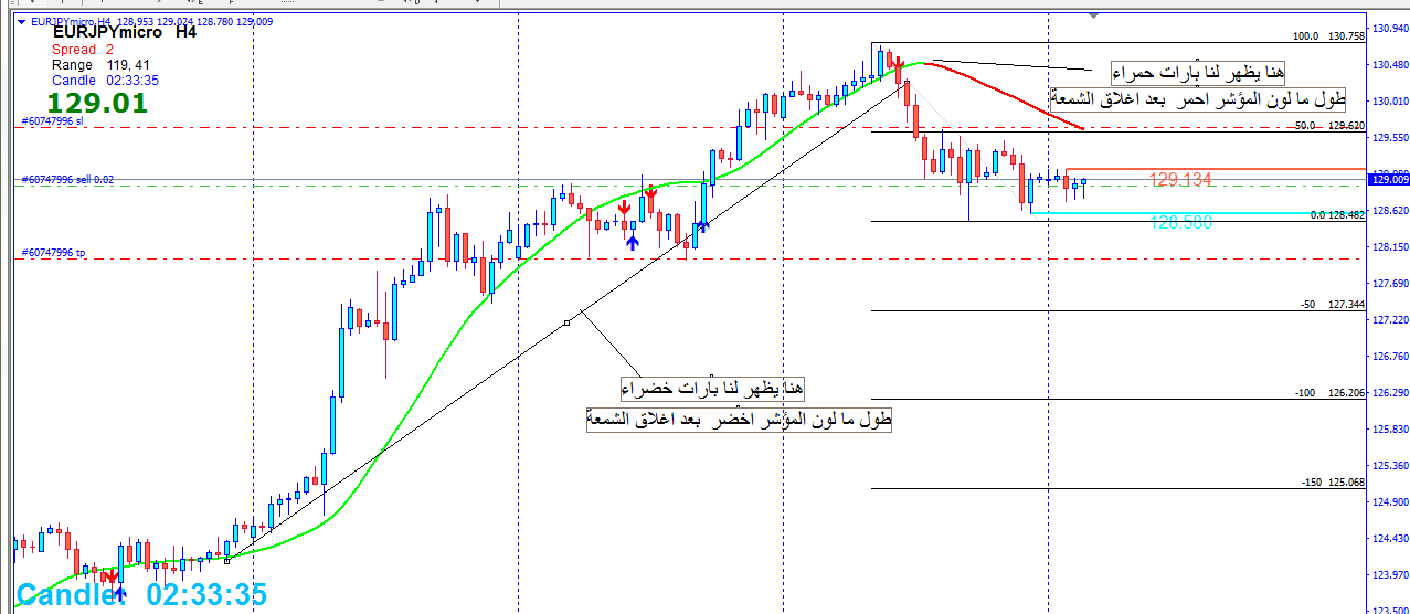 - يظهر بار صاعد بعد اغلاق الشمعة ويكون لون المؤشر اخضر