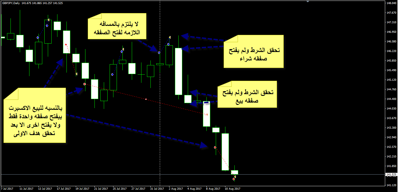 الشمعه الحاليه تكون لها هاى عند سعر 146.80 والمسافه المطلوب تحققها من تحت الهاى 30 نقطه يبقى مطلوب يتم فتح الصفقه الشراء عند سعر 146.50