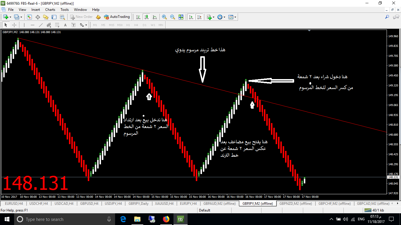 مثلا السعر نازل من الاعلى الى الاسفل ولامس الخط المرسوم وراتد شمعتين ندخل شراء