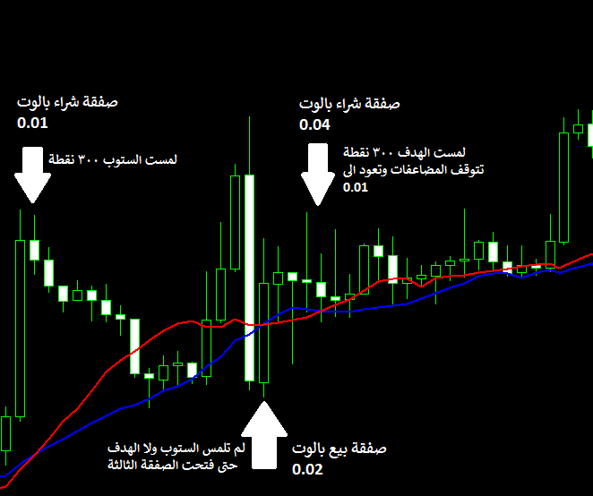 مضاعفات مبنية على نتيجة آخر صفقة مغلقة يعني دائما يوجد صفقة واحدة فقط، وحجم عقدها يكون مضاعف في حال الصفقة السابقة اغلقت على خسارة