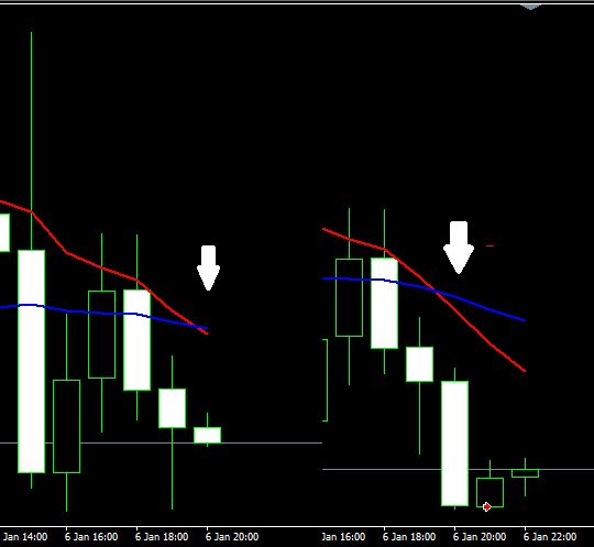 ففي هذه الصورة كان يجب على الأكسبرت فتح الصفقة عند لحظة تقاطع الخطين لكن الأكسبرت أنتظر حتى أغلاق الشمعة حتى يفتح الصفقة
