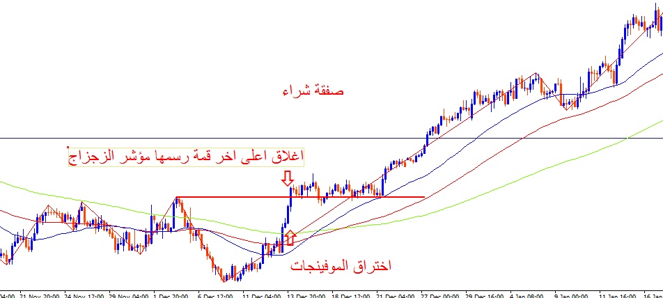 اختراق الموفينجات للاعلى ومن ثم اغلاق شمعة اعلى اخر قمة رسمها مؤشر الزجزاج كما هو موضح في الشارت