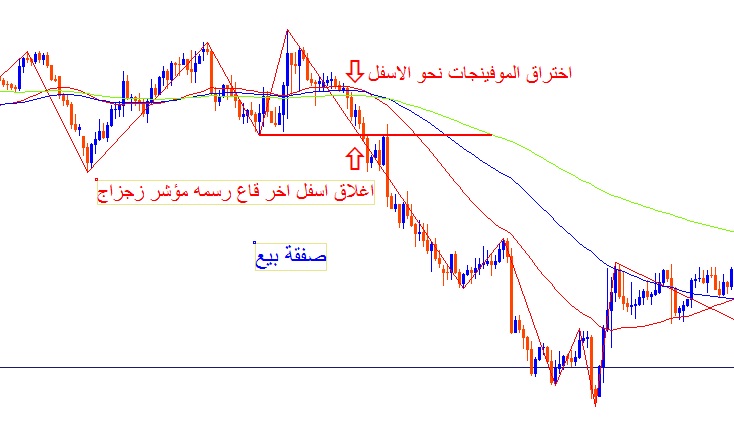 اختراق الموفينجات نحو الاسفل واغلاق اسفل اخر قاع رسمه مؤشر الزجزاج كما هو موضح في الشارت
