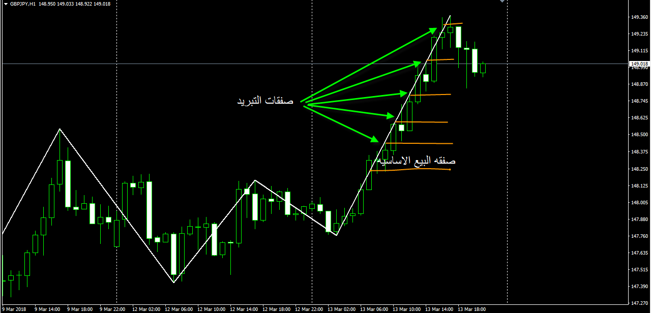 اذا كان اخر ضلع زجزاج صاعد وطوله مسافه معينه يتم فتح صفقه البيع الاساسيه ويتم فتح 5 صفقات تبريد وكل صفقه من صفقات التبريد لها مسافه معينه خاصه بها وحجم لوت وهدف خاص بها
