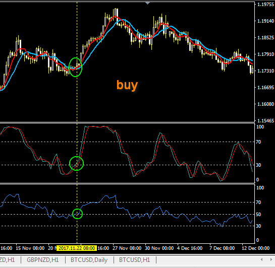 الدخول شراء في حالة قطع خط موفينج 5 الاحمر خط موفينج 10 الازرق لاعلى + قطع مستوى 50 في rsi لاعلى +قطع خطوط الستوكستيك للمستوى 30 لاعلى