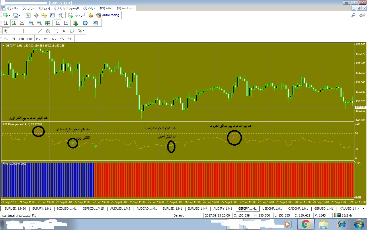 الطريقة حسب الصورة والشرح المرفق تتكون من مؤشرين فقط الفلتر ومؤشر الدايفرنجس الذي هو من صنعك ويكون كالتالي