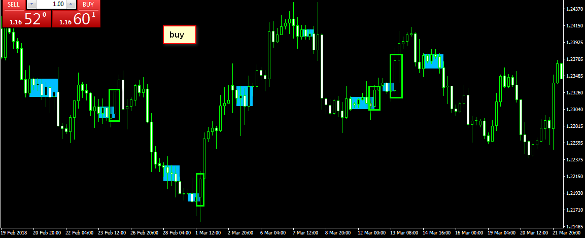 عندما يخرج السعر من اعلى الصندوق و بعد اغلاق تلك الشمعة خارج المكعب يفتح الاكسبرت امر شراء