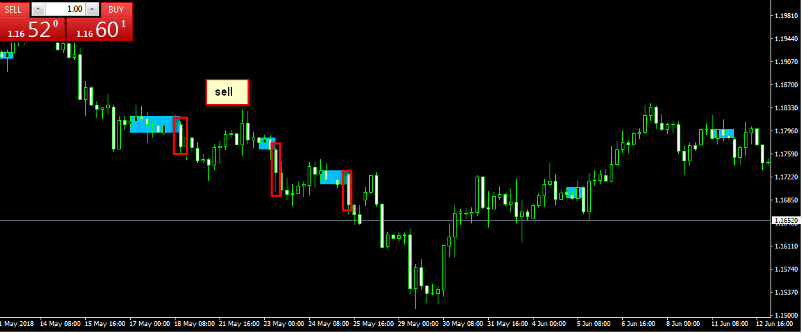 وعندما يخرج السعر من اسفل الصندوق و بعد اغلاق تلك الشمعة خارج المكعب يفتح الاكسبرت امر بيع