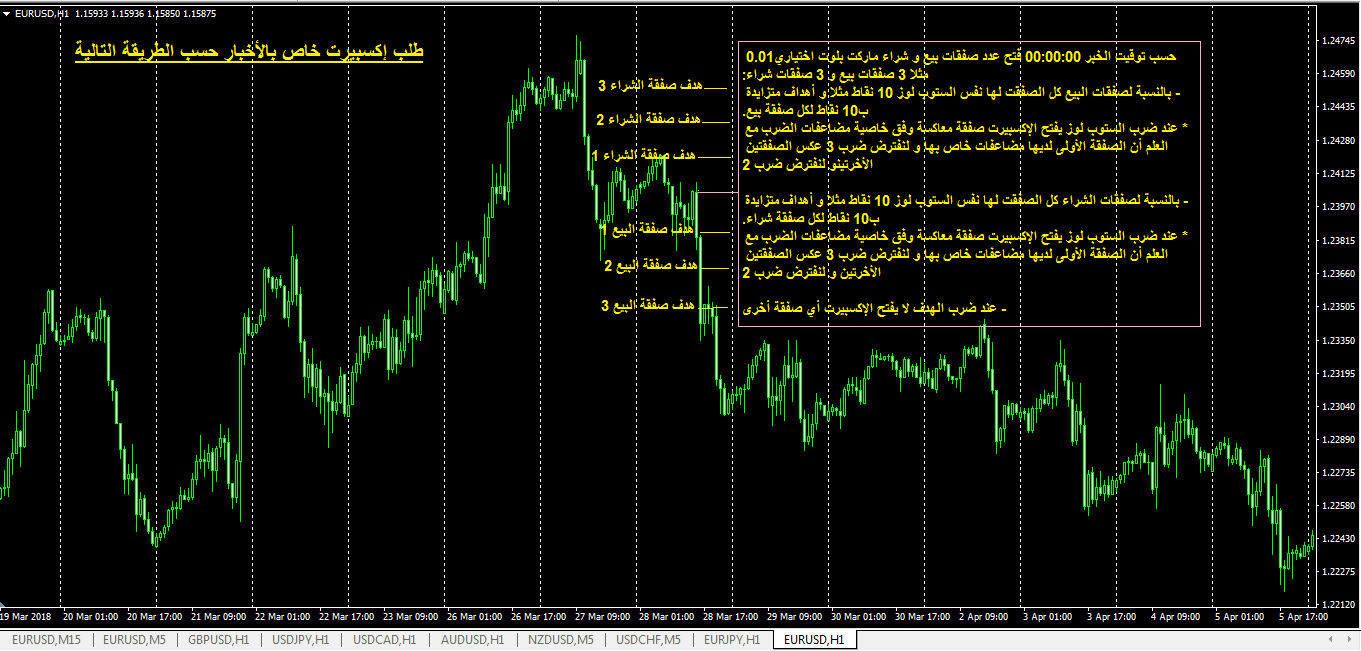 - عند ضرب الهدف يتوقف الإكسبيرت عن فتح صفقة أخرى لكن عند ضرب الستوب لوز يتم فتح صفقة معاكسة حسب خاصية مضاعفات الضرب.