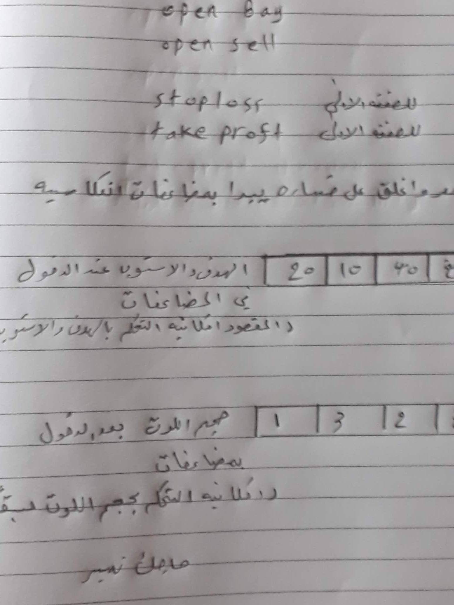 السلام عليكم..ارجو عمل اكسبيرت مضاعفات انعكاسيه في حاله انعكاس السعر للدخول الاول.بحيث يكون لكل مضاعفه هدف واستوب وحجم اللوت خاص بها يمكن ادخاله قبل بدا عمل الاكسبريت..عسى ان تحل الرياضيات معضله سوق الفوركس... ودمتم بود...