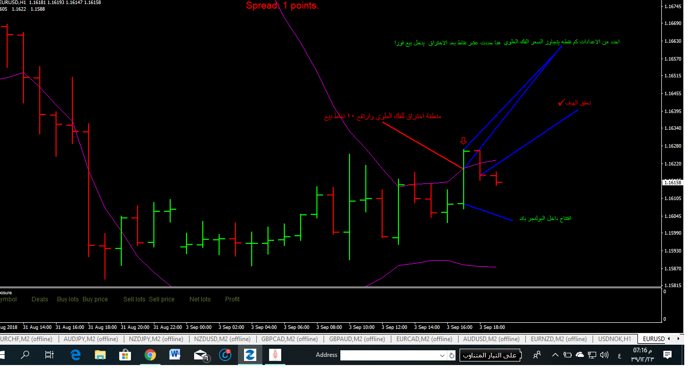 الشراء : افتتاح شمعه داخل البولنجر باند ثم تكسر الفك السفلي بعدد من النقاط نحددها من اعدادات الاكسبيرت الخارجيه ثم يقوم بالشراء مع تك برفت و ستب فقط