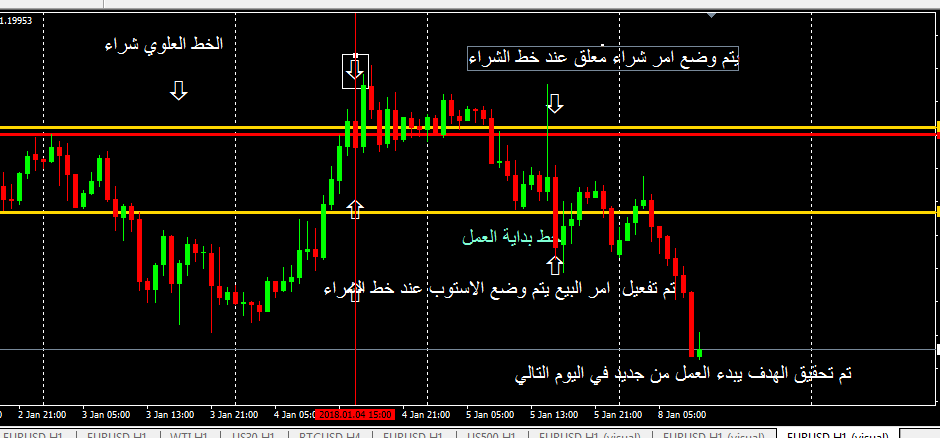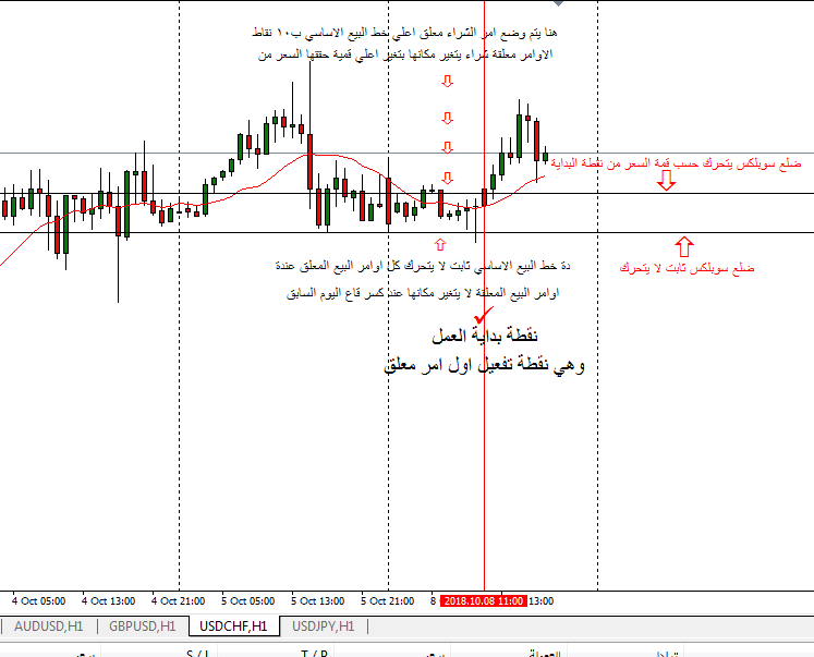 نفترض ان السعر لمس الخط العلوي شراء يتم عندها وضع امر معلق بيع اسفل الخط ب10 نقاط ( متغير )