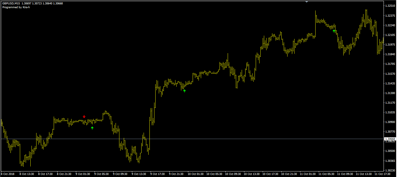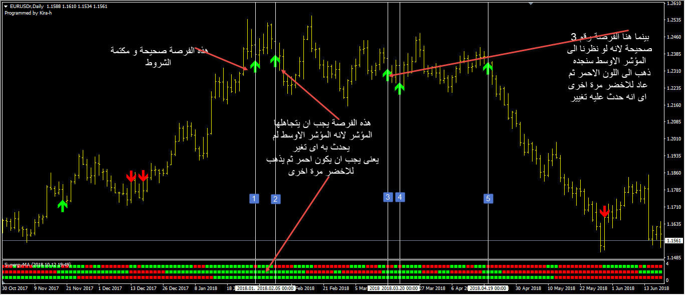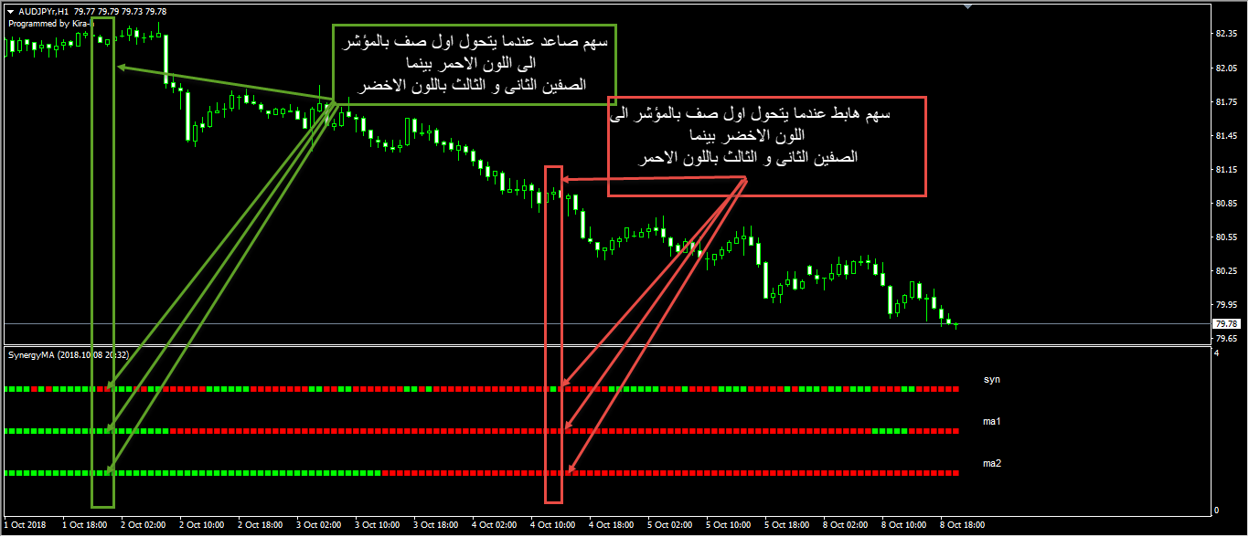 انه يرسم سهم صاعد عندما يصبح المؤشر الاول باللون الاحمر و الثانى و الثالث يكون لونهم اخضر