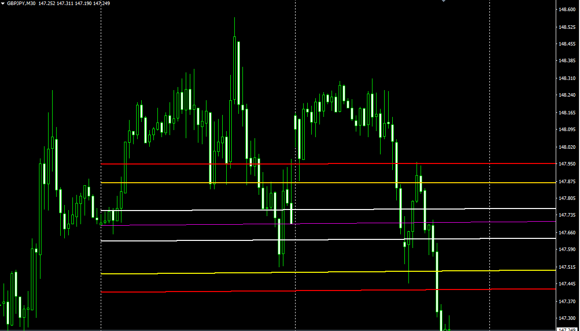 رسم 3 خطوط موازيين لخط المؤشر من فوق ومن تحت بحيث ان كل خط من الثلاث خطوط يبعد مسافه معينه من خط المؤشر الاساسى يعنى مطلوب 3 خانات لتحديد المسافه لكل خط وكل خط له لون مختلف عن باقى خطوط المؤشر