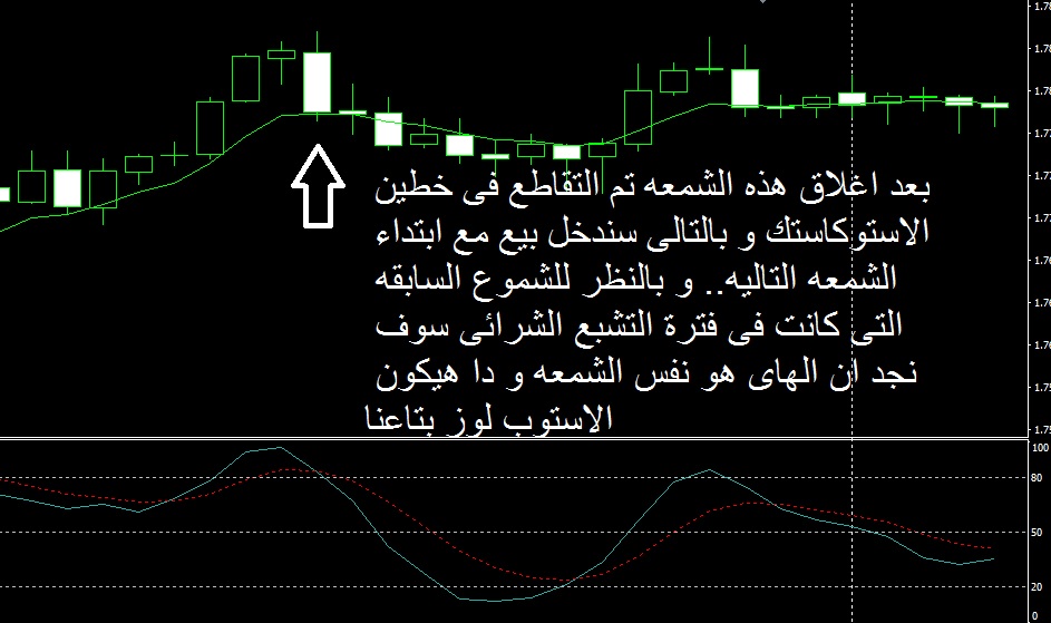 و المفروض ان الاستوب لوز بيبقى اعلى سعر تم الوصول له خلال فترة ما قبل تقاطع خطين الاستوكاستك لحين حدوث التقاطع