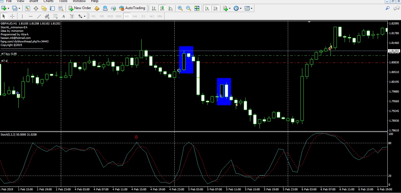 انا بقى عايز المؤشر يقوم فاتح صفقه من بدايه الشمعه التاليه للشمعه اللى بالخط الاخضر دى و يحسب الاستوب لوز من خلال اللو لل 4 شموع اللى كانوا تحت مستوى ال 20 قبل ما يحصل التقاطع...اللى هو فى الصورة هنا الشمعه التالته اللى باللون الازرق لان دى اكتر شمعه عملت لو و يقوم عامل الهدف نفس عدد الاستوب