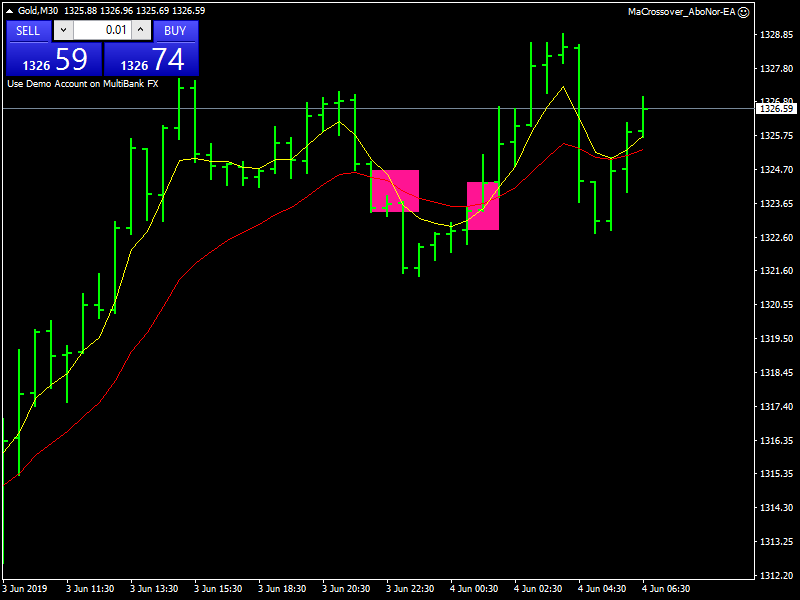 وضعت الاكسبيرت بالاعدادات الافتراضية لكن لا يفتح صفقات رغم حدوث التقاطع كما موضح بالشارت
