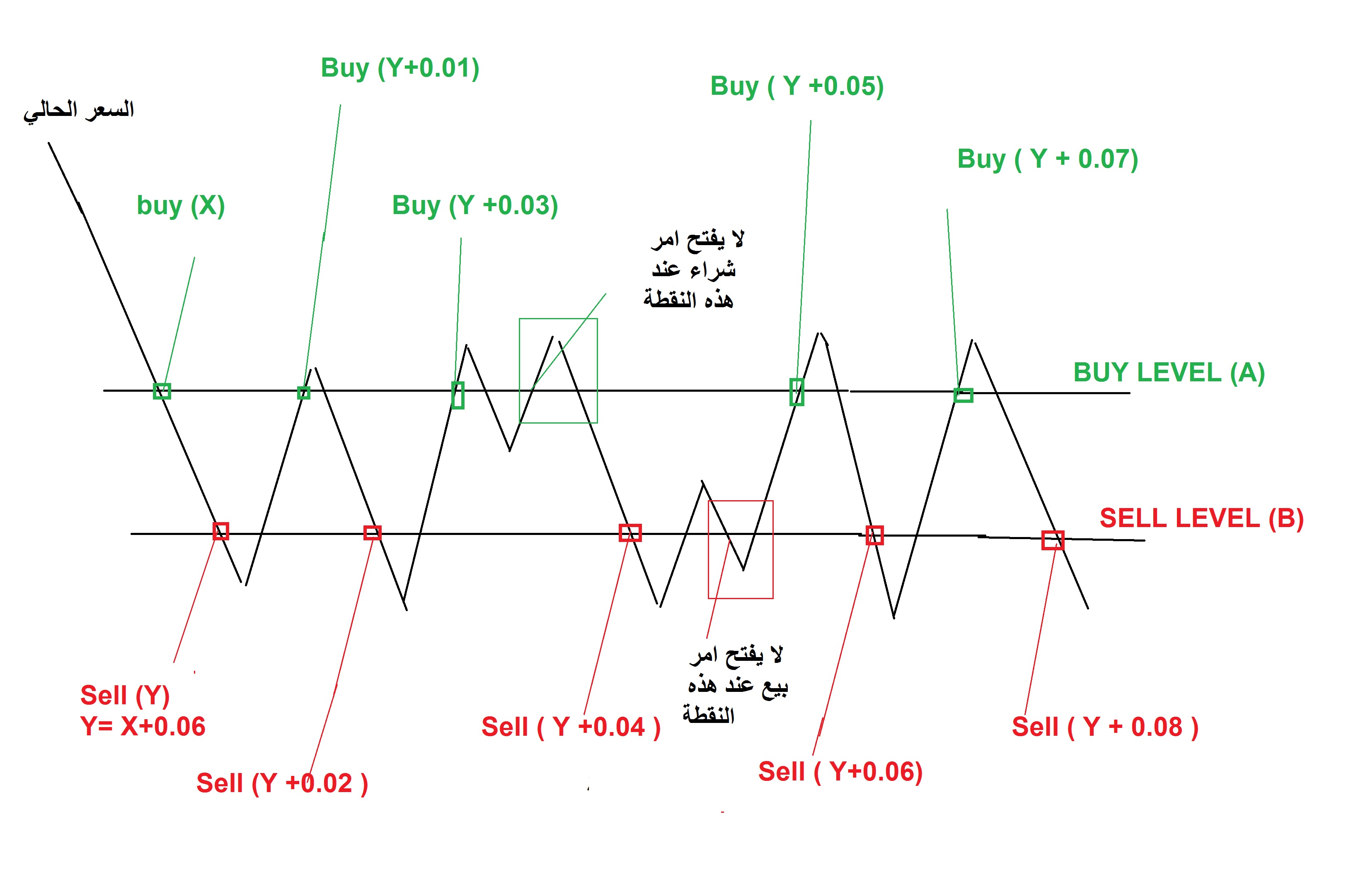 نحدد مستوى شراء(A) ومستوى بيع بشكل يدوي (بحيث تفتح الصفقات ويبدا عمل الاكسبيرت عند الوصول للمستوى A وB والبعيدين عن السعر الحالي - بمعنى انه يمكن ضبط المستويين A . B بشكل يدوي في الاكسبرت و هما بعيدان عن السعر الحالي ( يمثل المستويين A . B مستويين دعم و مقاومة أحددهم أنا ثم اضيفهم للاكسبرت بانتظار وصول السعر الى هذه المناطق )
