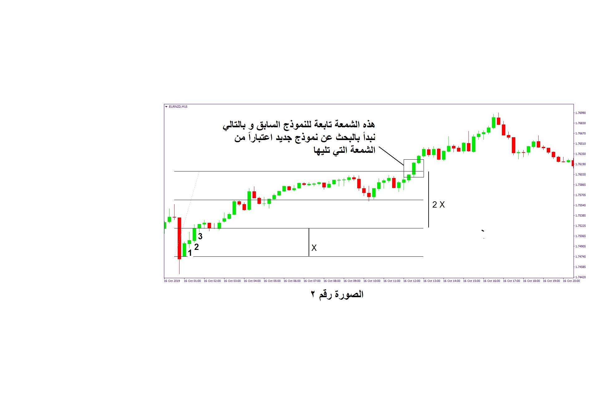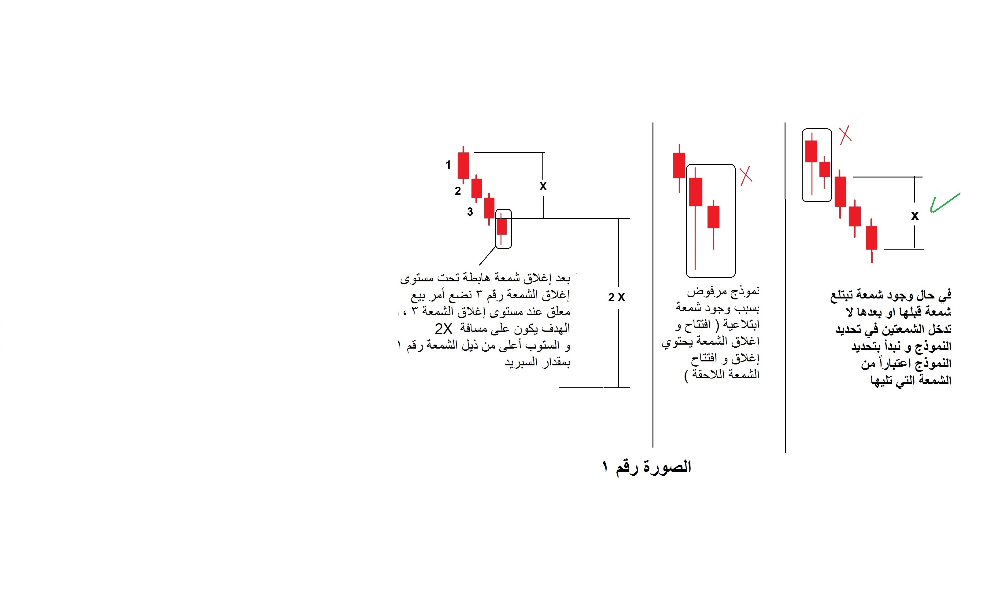 عند تشكل نموذج مؤلف من 3 شمعات متتالية في نفس الاتجاه ( 3 شمعات هبوط او 3 شمعات صعود ) و لتكن كما في الصورة التوضيحية 3 شمعات هبوط