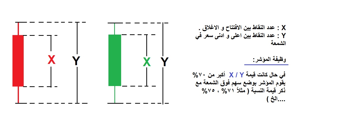 مرفق صورة توضح وظيفة المؤشر حسب قيم ( الافتتاح , الاعلى , الادنى , الاغلاق ) للشمعات