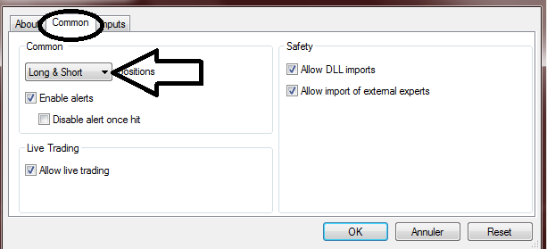 ومن خلال الصور السابقة يوجد لديك الخطأ 4110 أي أن الشراء غير مفعل بالاعدادات بخانة common، والاكسبيرت يحاول فتح صفقة شراء فيحدث تعارض ثم ظهور هذا الخطأ ثم التنبيه