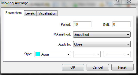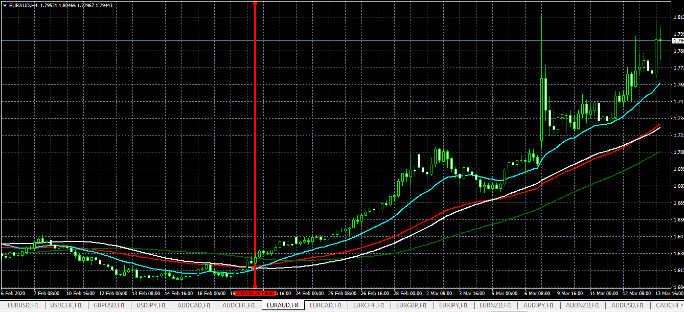 اغلاق شمعة او اكثر اعلى الموفينج الازرق 10 smoothed على فريم الساعة مع اختراق السعر لاعلى موفينج 80 الأخضر على فريم الاربع ساعات مع شرط ان موفينج الاخضر يكون هو اسفل جميع الموفينجات الاخرى على فريم الاربع ساعات