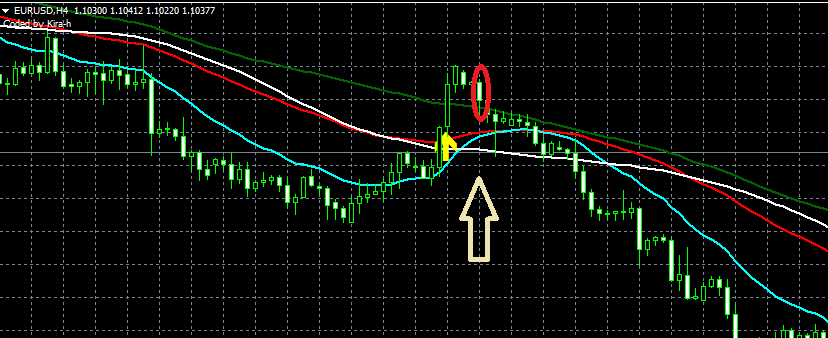 كما انني وضعت 5 ولم يعطي سهم على الشمعة الخامسة التي عليها دائرة حمراء كما بالصورة بل اعطى على اول شمعة اخترقت الموفينج الاخضر