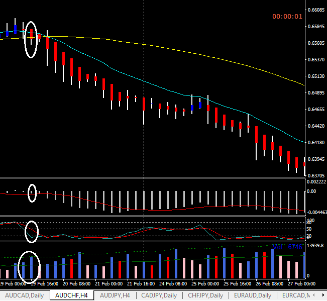 مؤشر الفوليوم شمعة الدخول تكون اعلى من الشمعة السابقة ولا يلمس المستوى العلوى للمؤشر