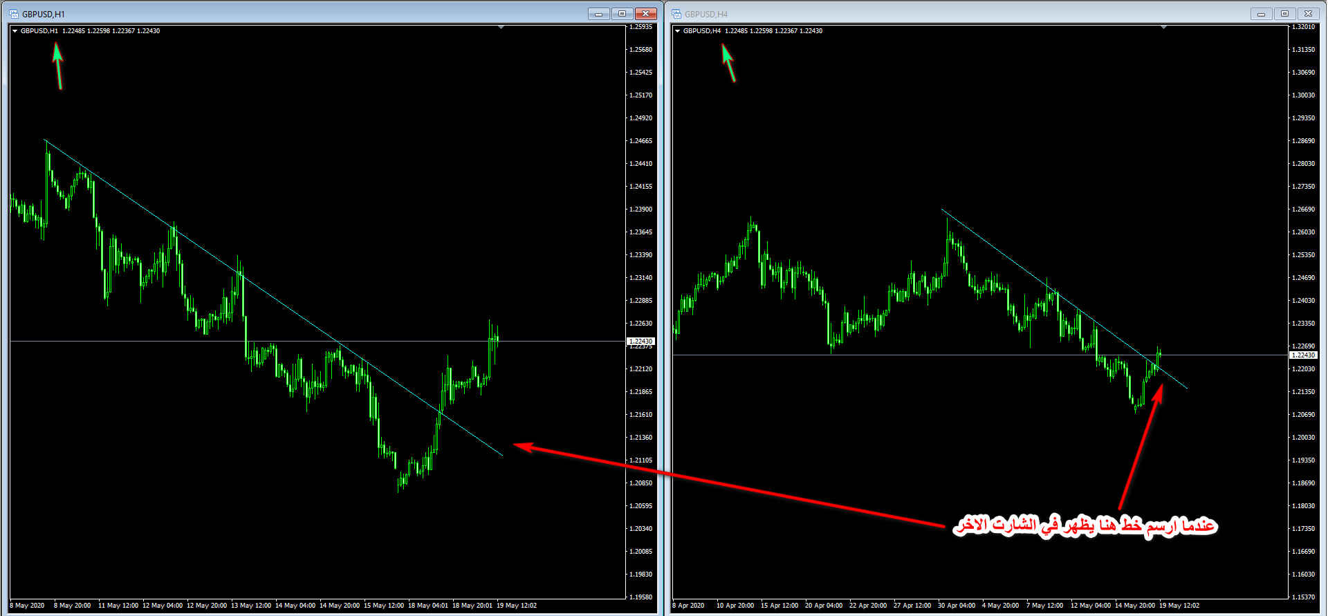 ارسم خط افقي او اي خطوط على شارت الاربع ساعات يظهرتلقائياً ايضا في شارت الساعة