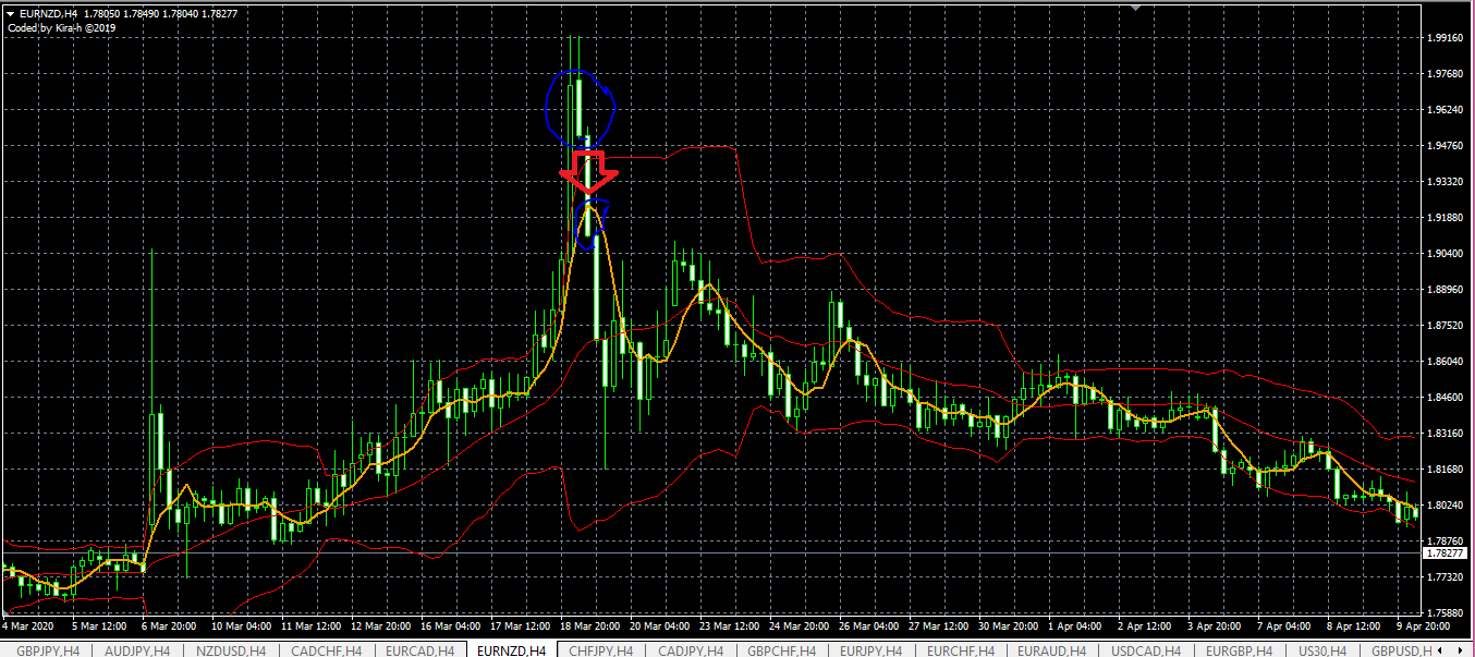 يعطي اشارة بيع في حالة اغلاق شمعة هابطة أعلى الخط العلوي للبولينجر وبعد اغلاق شمعة أسفل موفينج أفريج 5