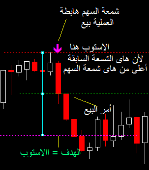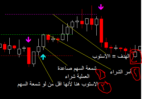 الاستوب أسفل لو شمعة السهم أو الشمعة السابقة لها إيهما أقل - وبنفس قيمة الاستوب يكون الهدف ناقصا قيمة الاسبريد وليكن 5 نقاط للأمان