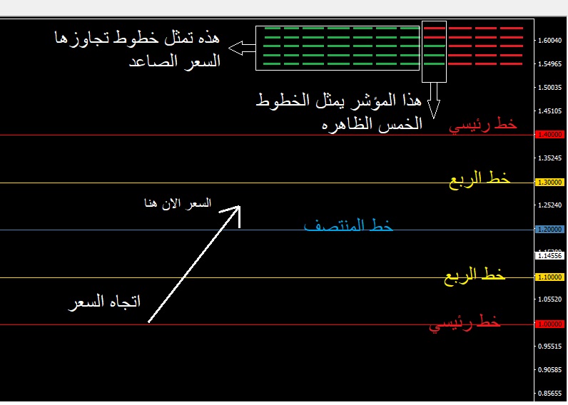 سوف يقوم المؤشر برسم الخط الثاني عند 1.20 والخط الذي بعده عند 1.40 والذي بعده 1.60 وهكذا ....وتعتبر خطوط رئيسيه