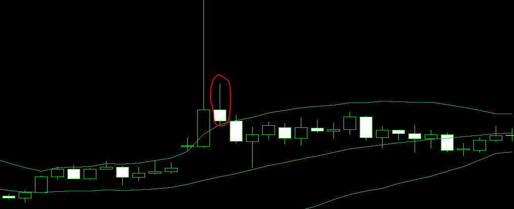 1- اذا تم فتح شمعة واغلاقها هابطة أعلى الخط العلوي للبولينجر يعطي سهم أحمر للبيع