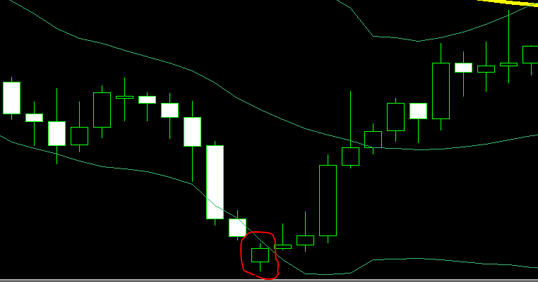 2- اذا تم فتح شمعة واغلاقها صاعدة أسفل الخط السفلي للبولينجر يعطي سهم أصفر للشراء
