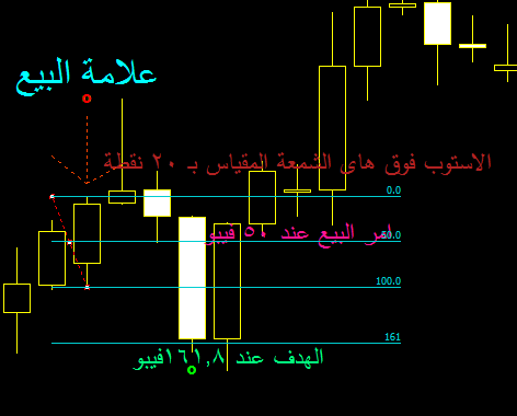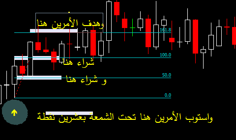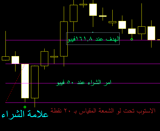 ثم يوضع امر شراء عند 50% فيبو والهدف عند 161.8 فيبو والاستوب تحت لو الشمعة بـ 20 نقطة