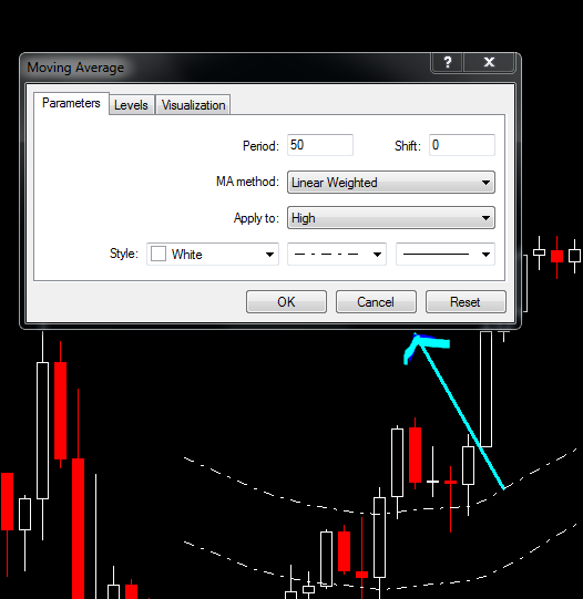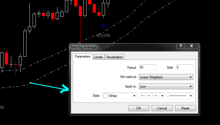 2- والعكس فى حالة اغلاق شمعة اسفل الاثنين موفنج أو هى اصلا بالأسفل يتم فتح مركز بيع