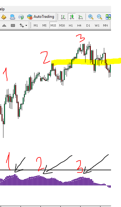 ملحوظة هااامه : يتم ظهور التنبيه على شكل سهم احمر بمجرد ان يقوم السعر فى القمة رقم 3 باختراق الهاى للقمة المشار اليها فى الصورة برقم 2 ( مستوى الهاى او القمة المقصود محدد بخط اصفر للتوضيح ) و يكون مؤشر الماكد فى نفس توقيت اختراق القمة رقم 2 فشل فى تحقيق قمة ثالثة على المؤشر الماكد اعلى من القمة رقم 2 التى بدورها تكون ايضا اقل من القمة رقم 1 كما وضحنا سابقا
