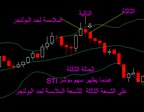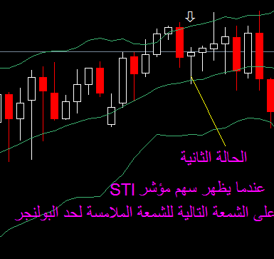 2- عندما يظهر مؤشر Sti_obos على الشمعة التالية للشمعة الملامسة لحد البولنجر