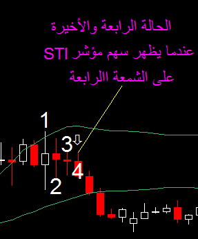 4- عندما يظهر مؤشر Sti_obos على الشمعة الشمعة رقم 4 باعتبار الشمعة الملامسة لحد البولنجر هى رقم 1
