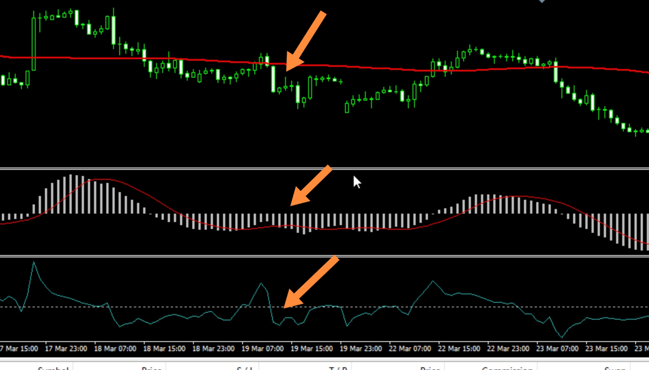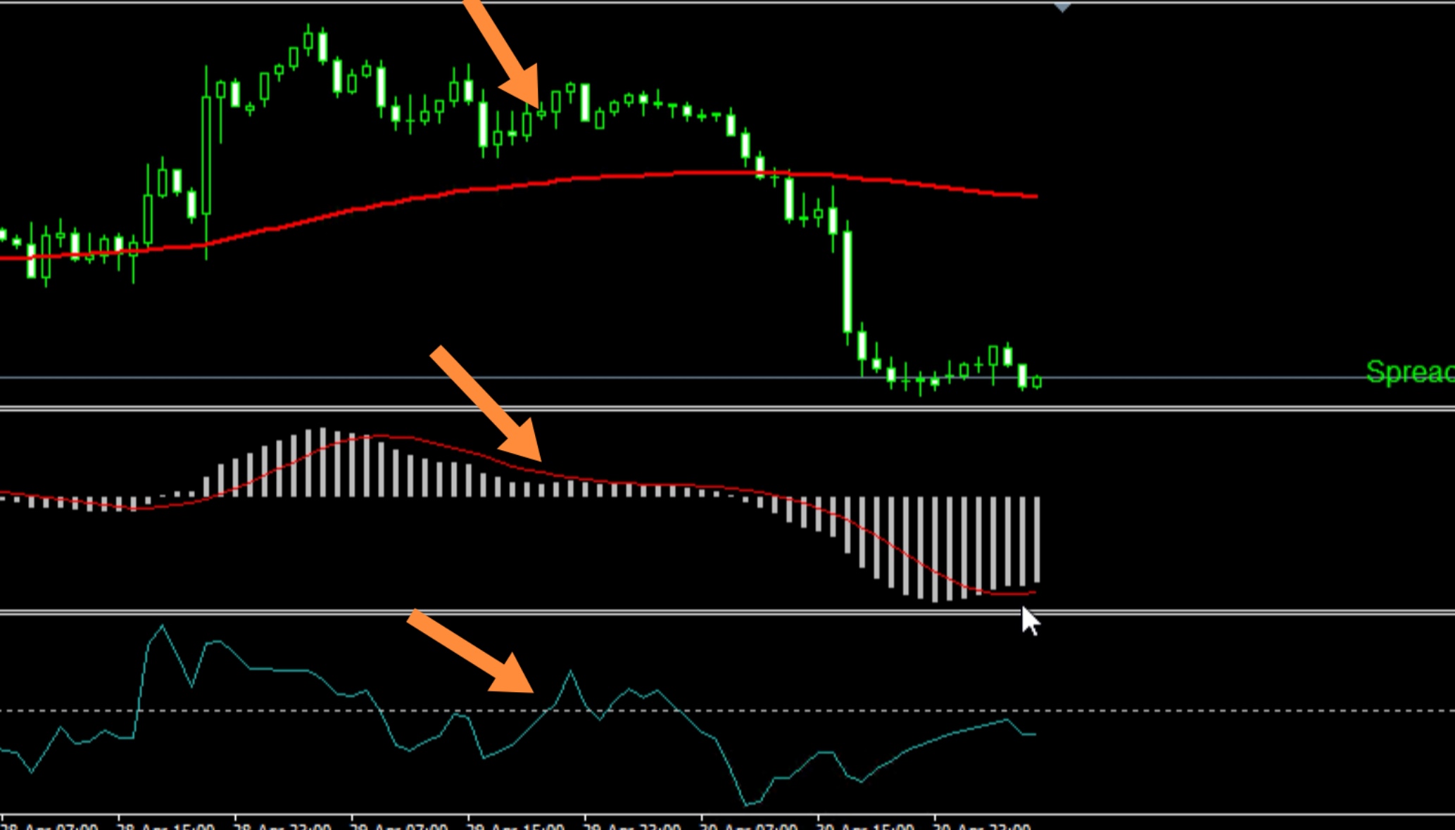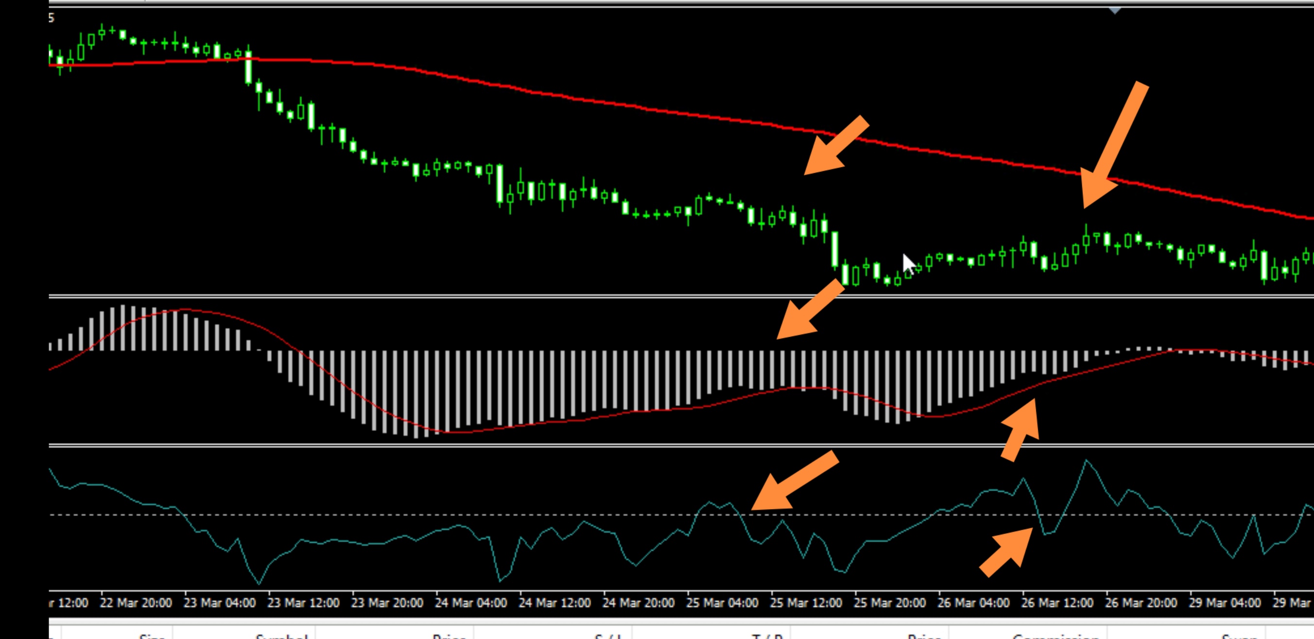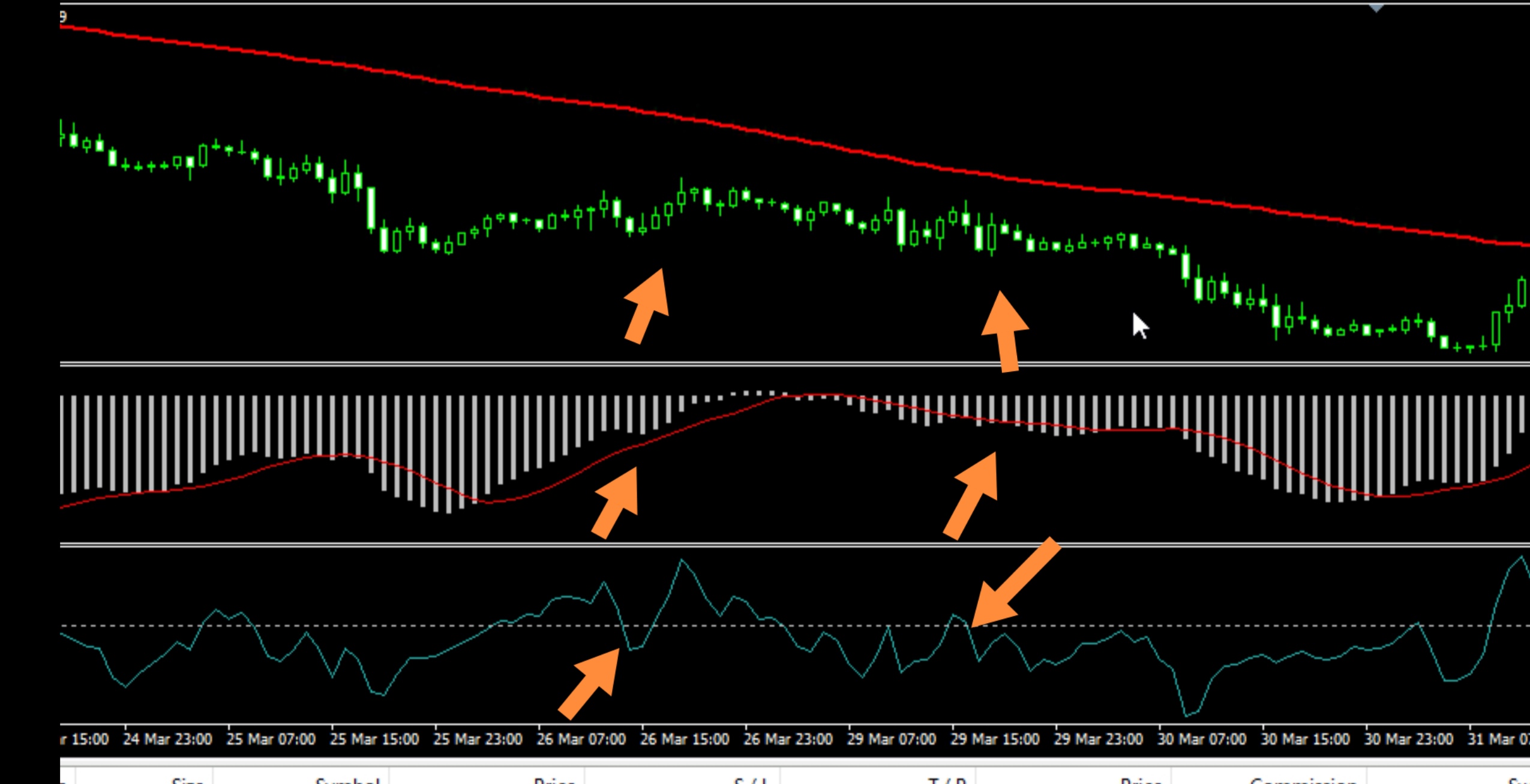 بالعكس في صفقة البيع يجب أن يكون السعر أو الشمعة حين دخول الصفقة أسفل الموفينج أفريج، وأن يكون الماكد للأسفل.