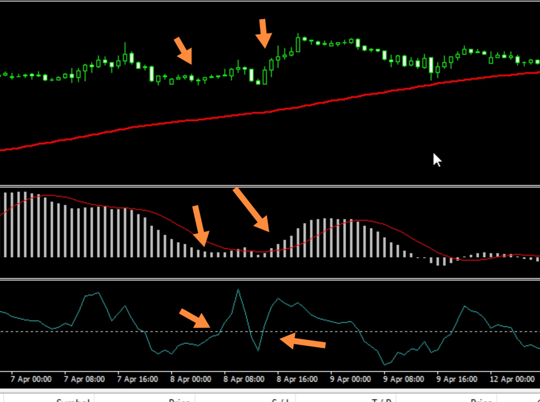 مع مؤشر الcci يتم الاستعانة بمؤشري الموفينج أفريج والماكد لتأكيد الدخول.