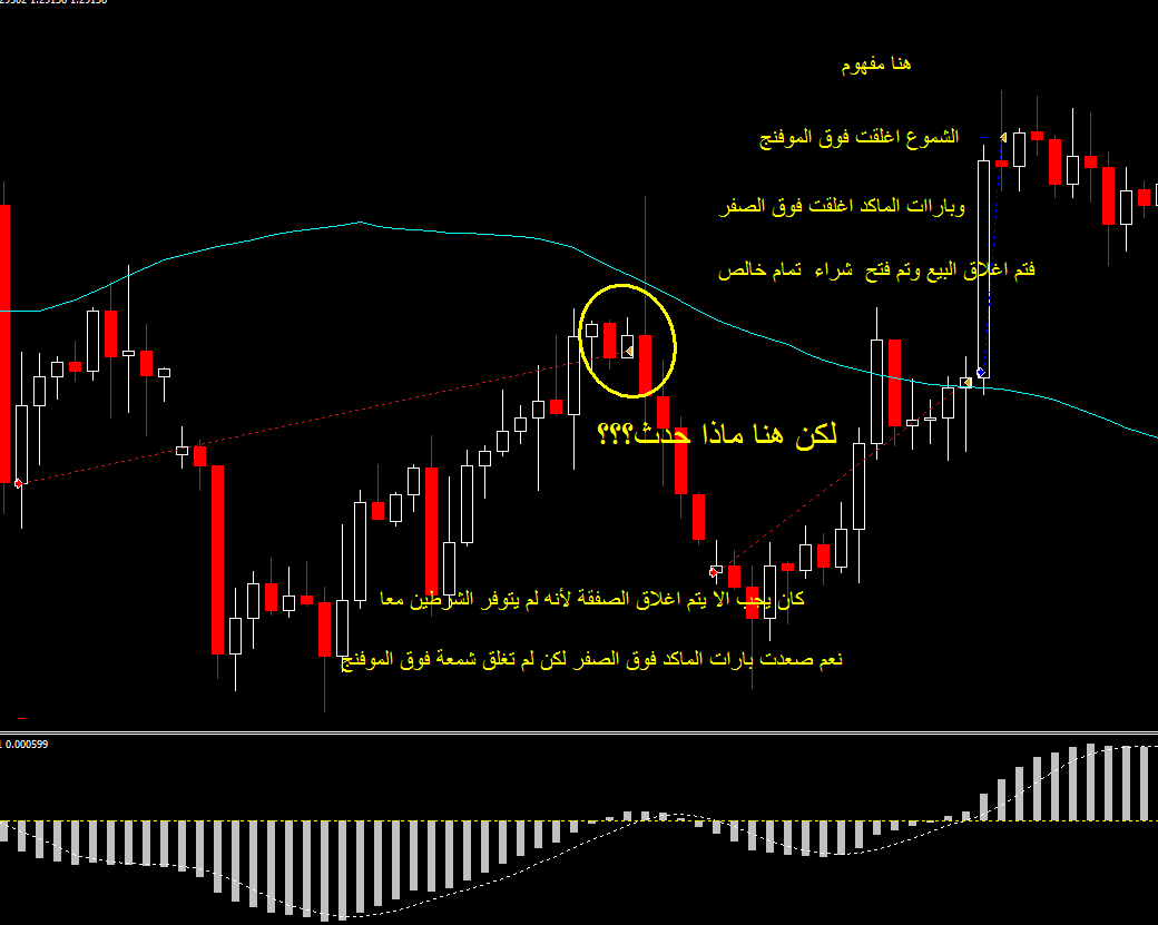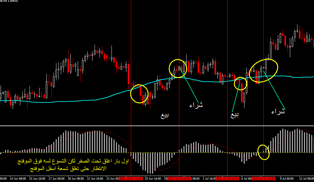 ثالثا : العبرة بأول بار يغلق فوق خط الصفر يتم فتح صفقة شراء إذا كانت الشمعة التى مع البار أغلقت فوق خط الموفنج او يتم الانتظار حتى تغلق شمع فوق الموفنج طبعا اذا كانت بارات الماكد ما زالت فوق الصفر