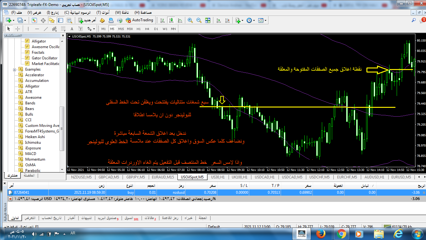 بحيث كل كم نقطة تتم المضاعفة ونخرج من كل الصفقات عند ملامسة الشموع للخط العلوي للبولينجر