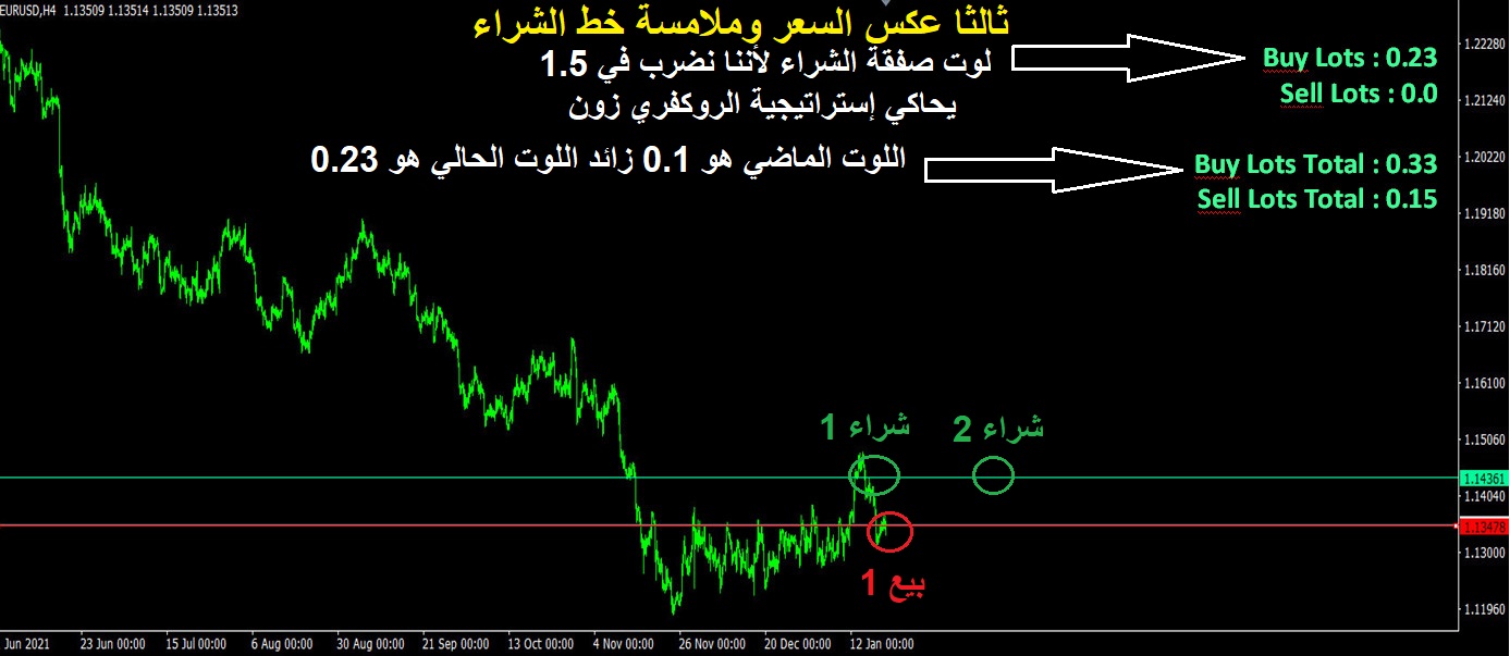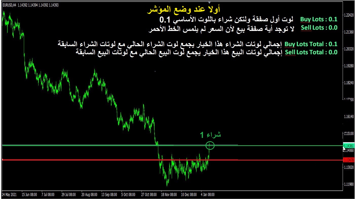 الخط الأول يمثل صفقة شراء أولى وبالتالي يكون الخط على السعر الحالي والذي ستفتح عنده صفقات الشراء الوهمية