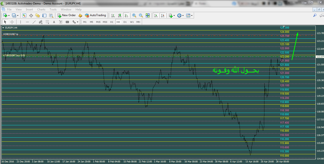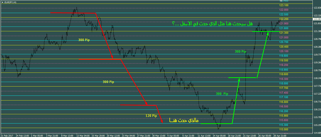 ثم نزل اسفل منه وعمل ارتكاز عند الرقم 120.700 من هنا ابدا حساب الــ 300 الاخرى حيث تحقق الشرط